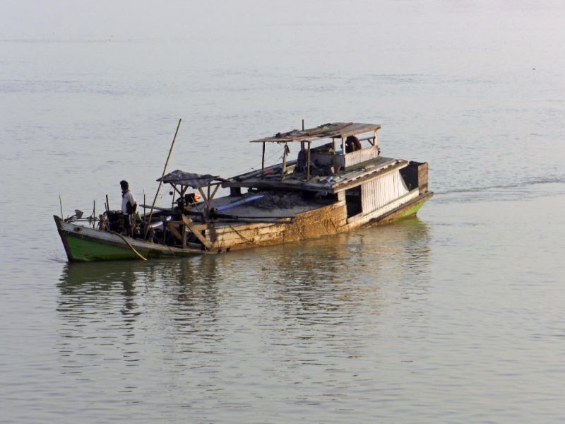 Das Schiff hat Sand geladen und fährt zum Ufer um die Fracht zu löschen.
