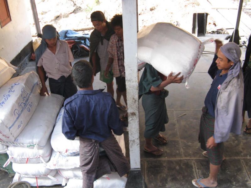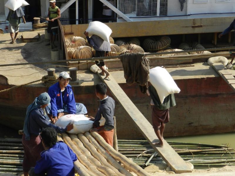 Ausser in Yangon habe ich nirgends Kräne zum Löschen der Ladung gesehen. Nicht nur Männer, sondern auch Frauen müssen die schweren Lasten tragen.